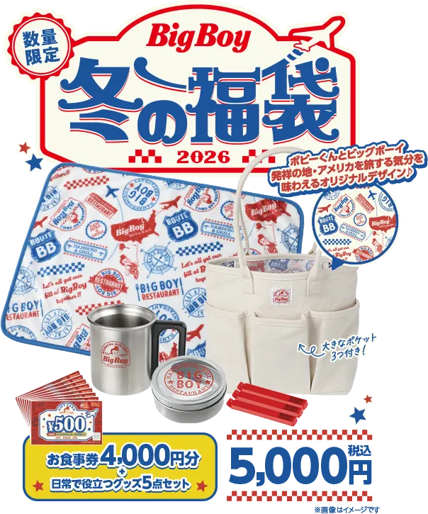 ビッグボーイ福袋2026は、4,000円分の食事券とオリジナルグッズがセットで5,000円という高コスパ内容。