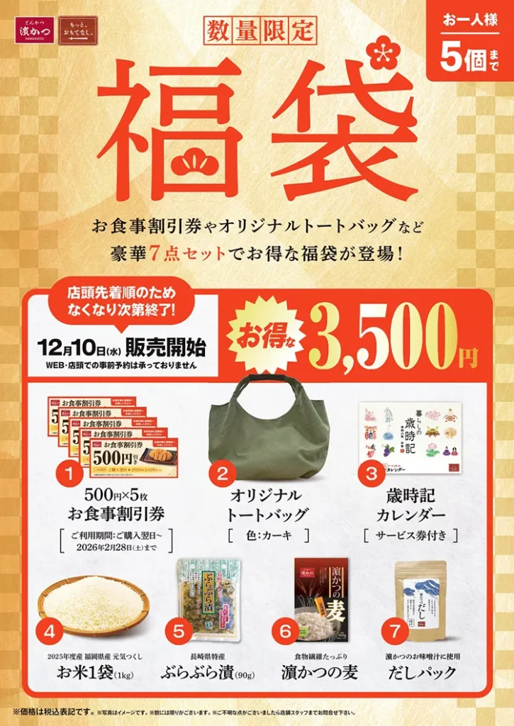 とんかつ専門店の濵かつが毎年販売する福袋は、割引券に加えてお米やだしパックなど実用的な内容で大人気。