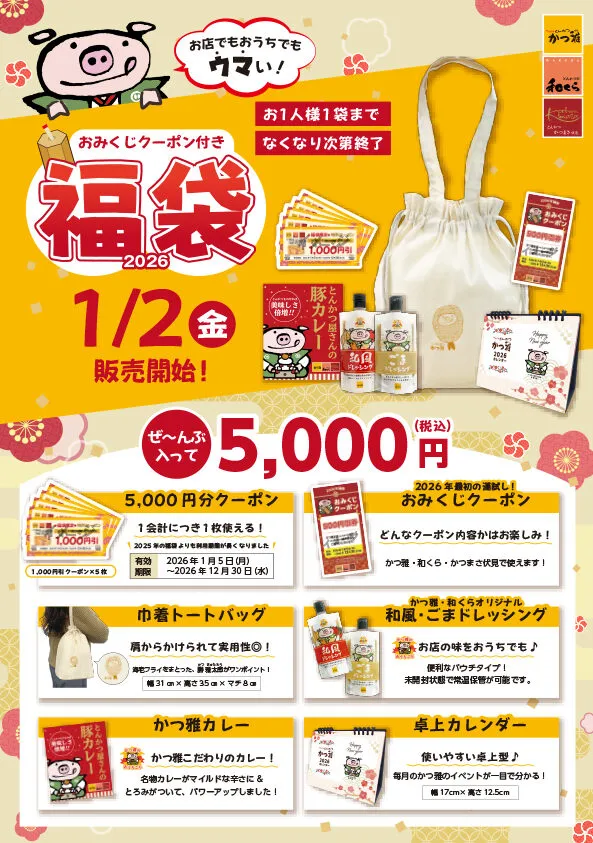 2026年の「かつ雅福袋」は、5,000円で5,000円分の食事券+おみくじクーポン+オリジナルグッズがセットになった、例年通りのお得な構成。